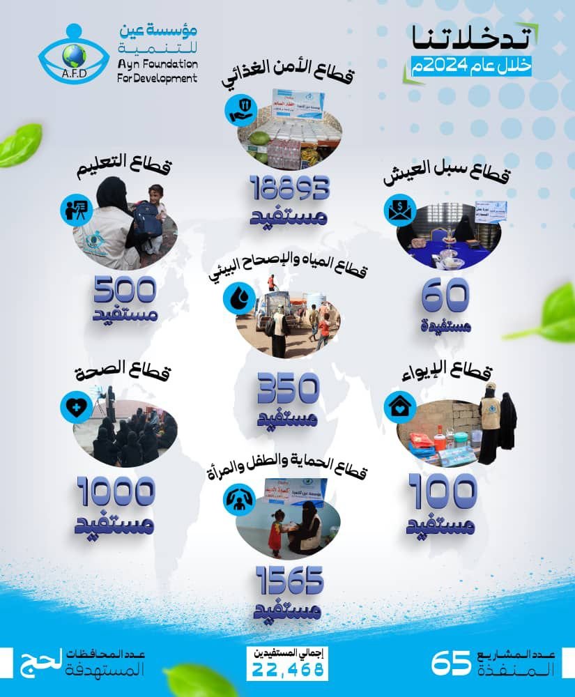 مؤسسة عين للتنمية هي مؤسسة إنسانية تنموية مستقلة وغير ربحية، تأسست في محافظة لحج عام 2021م. نعمل جاهدين على تحقيق التنمية المستدامة في مختلف المجالات، من خلال تحسين حياة الأفراد والمجتمعات التي نعمل فيها.